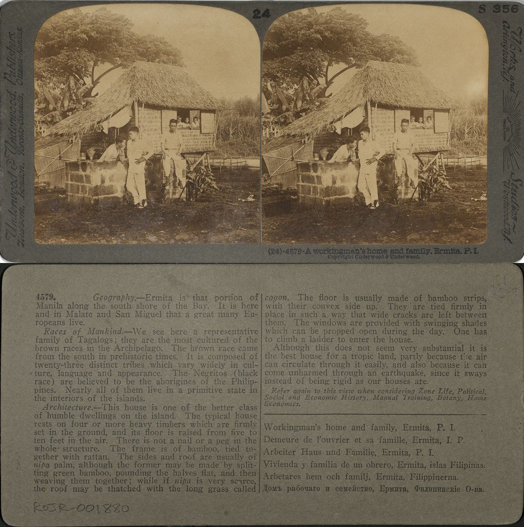 ROJR Stereoviews – Series 1.Type: Medium: 1 photographic print on stereo card : stereograph. 9 x 18 cm.Subject 1: Filipinos — Philippines — 1890-1900.Subject 2: Ermita (Manila, Philippines) — 1890-1900.Subject 3: Dwellings — Philippines — Manila — 1890-1900.Actual Image Location: Call Number: ROJR-001880Cataloger: GERRY