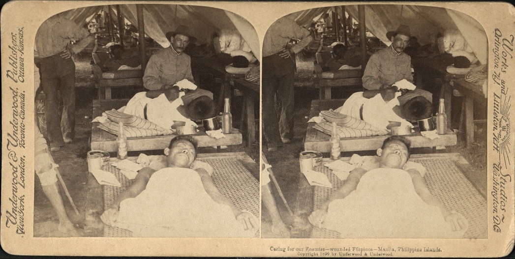 Creator : Underwood & UnderwoodDate Created: 1899Accession No: ROJR-001859Citation: Stereoviews binder 3, p. 4Location: ROJR-001685 to ROJR-002318 FINALROJR-001859F b2p38.jpgNotes: Underwood #U1315b. Wounded Filipino soldiers on cots receiving medical attention at U.S. military hospital, Manila, Philippines.