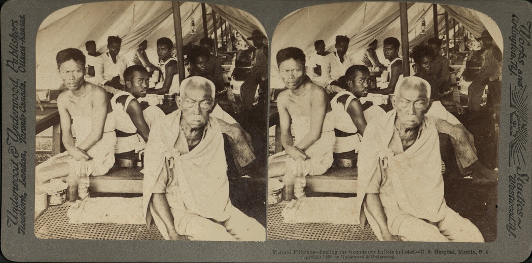 Creator : Underwood & UnderwoodDate Created: 1899Accession No: ROJR-001855Citation: Stereoviews binder 3, p. 2Location: ROJR-001685 to ROJR-002318 FINALROJR-001855F b2p36.jpgNotes: Underwood #U1305. Wounded Filipino soldiers sit on cots in tent of U.S. military hospital, Manila, Philippines.