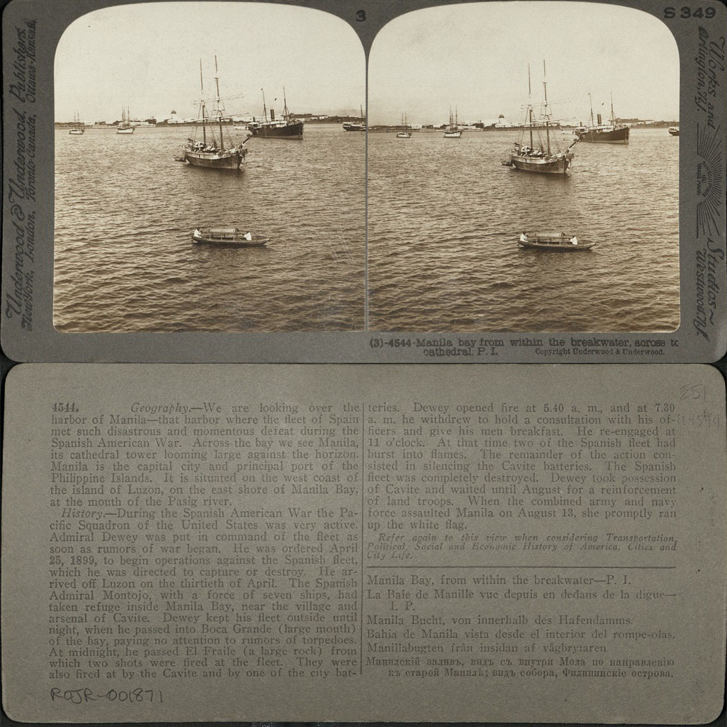 ROJR Stereoviews – Series 1.Type: Medium: 1 photographic print on stereo card : stereograph. 9 x 18 cm.Subject 1: Manila Bay (Philippines).Subject 2: Boats and boating — Philippines — Manila Bay.Subject 3: anila Cathedral (Manila, Philippines).Actual Image Location: Call Number: ROJR-001871Cataloger: GERRY