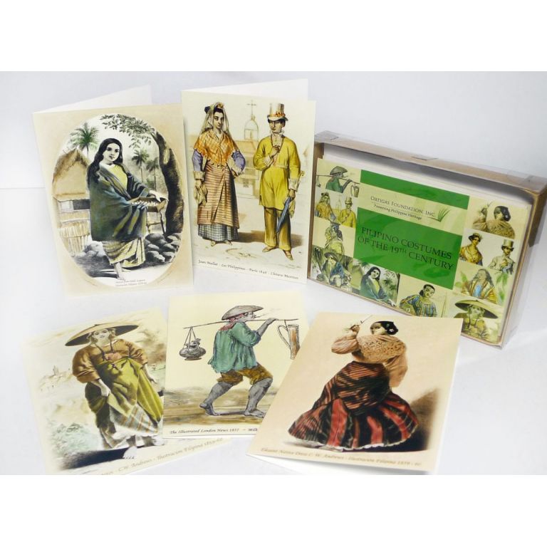Thanks to rapidly developing print technology mid-nineteenth century saw an upsurge in the number of illustrated newspapers and magazines around the world. Artists were employed to draw and paint beautiful and exotic sights and reproduce them as engravings and color lithographs. The lovely Filipino costumes used for these note cards first appeared in “Ilustración Filipina” here in Manila, in the “London Illustrated News” and in other publications abroad. They capture the elegant and graceful attire of cosmopolitan Filipino city dwellers and the rustic wear of the simple provincial inhabitants.